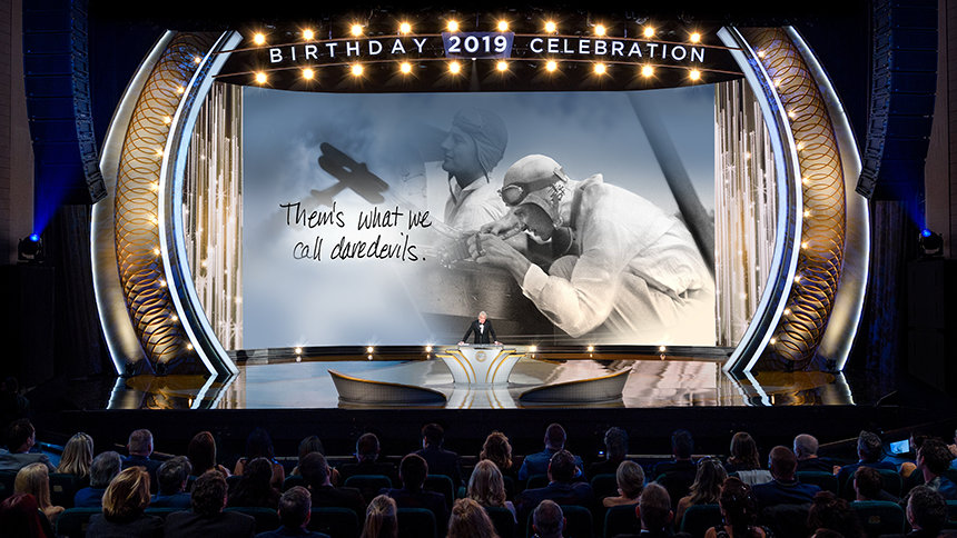 プレゼンテーションは中西部トウモロコシ畑の90メートル上空で始まりました。「フラッシュ」ハバードという名の20歳の曲芸飛行士が、飛行機モデル作りに夢中だった9歳の子供を含め、地元住民に飛ぶことの意味を示しました。 その少年…今や大人となって…は、若いパイロットが農場に着陸した後、好奇心もった住民に農場の上へと舞い上がるチャンスを与えたことを回想します。 それは、50年後のL. ロン ハバードの誕生日に祝われた、街の人たちにとても大きな印象を残した出来事でした。