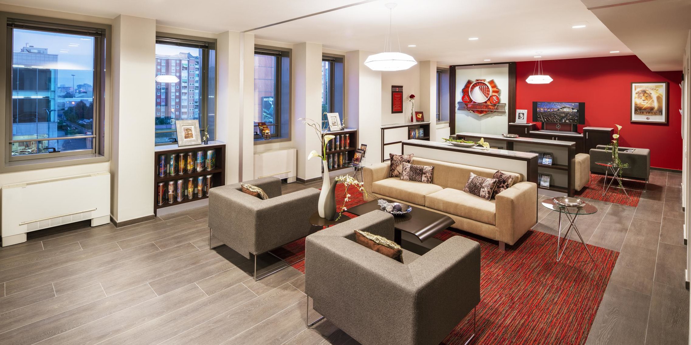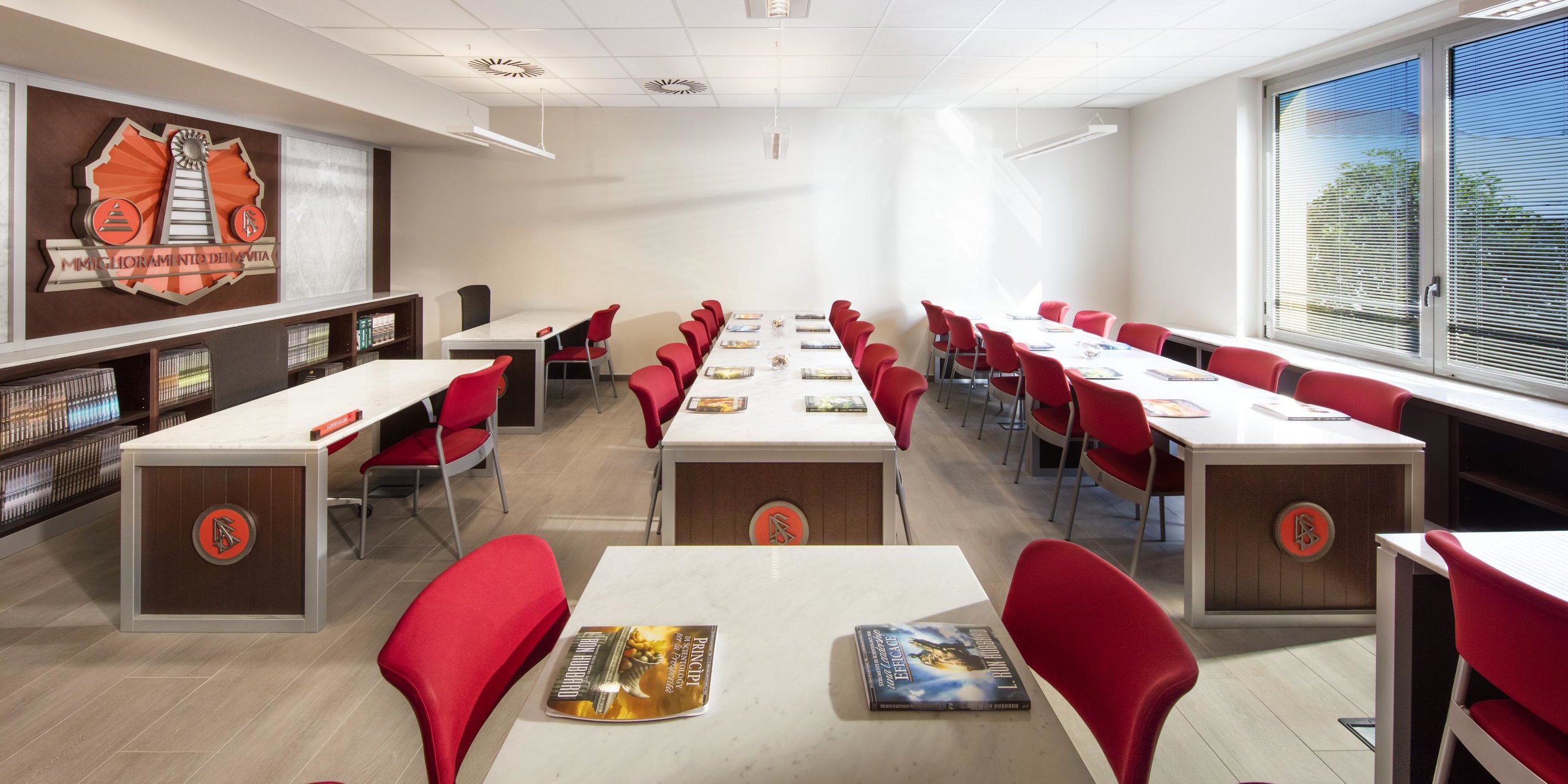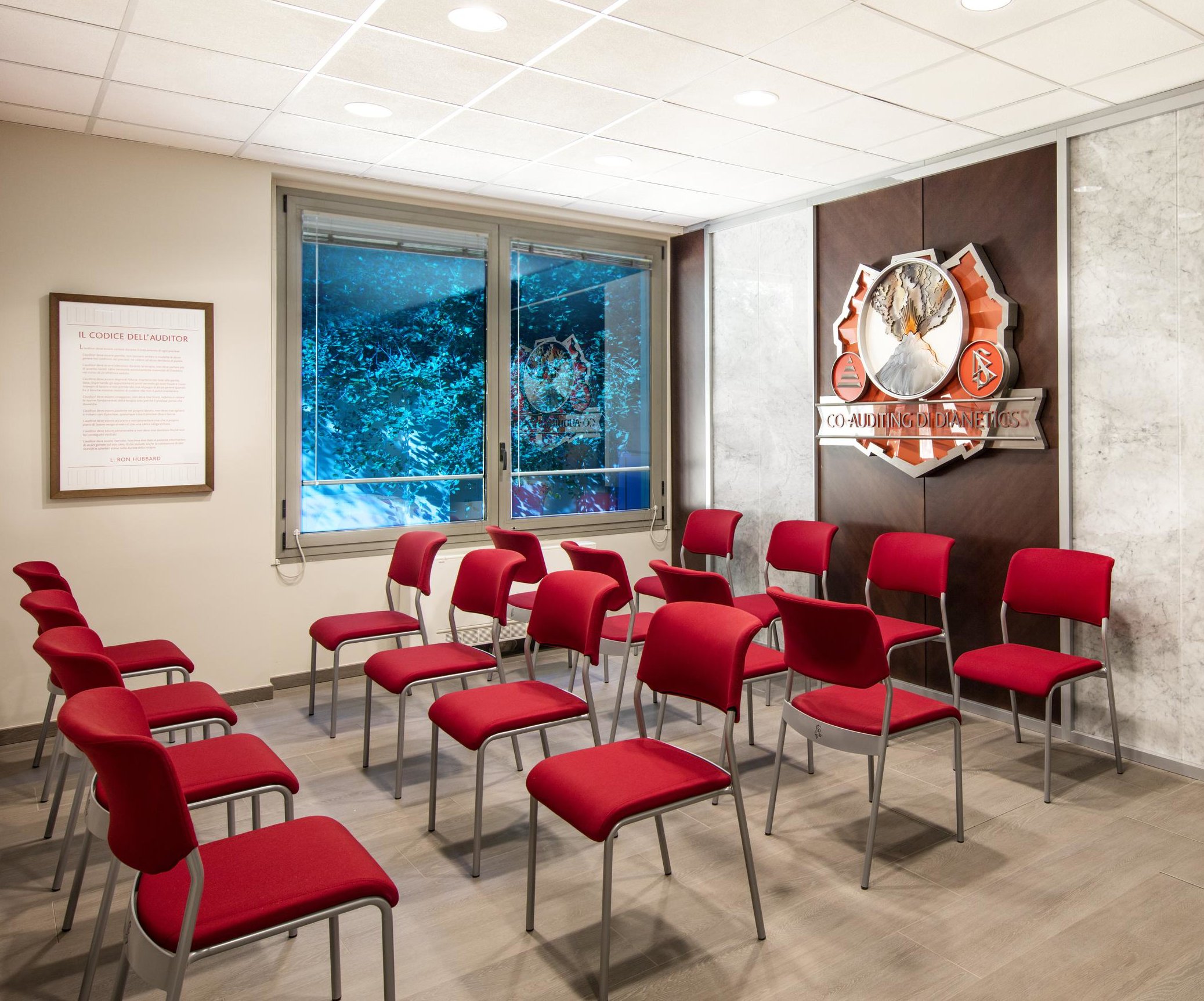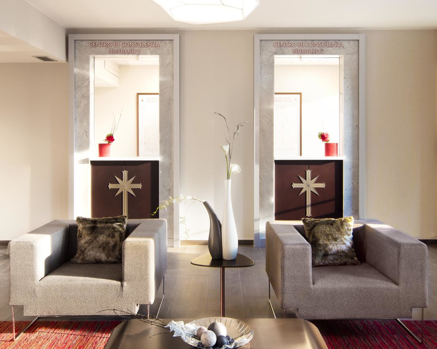 このハバード・ガイダンス・センターで、サイエントロジストは「オーディティング」と呼ばれる精神カウンセリングに参加します。 この待合エリアの向こう側には、サイエントロジー教会ミラノの教会員のためのオーディティング・ルームが並んでいます。