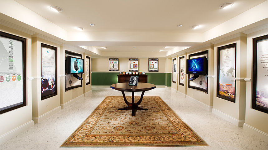 Among the many architectural elements the Church meticulously restored in Fraser Mansion is the reception’s ornate white marble fireplace with attached settees and intricately carved floral motif mantel and frieze.