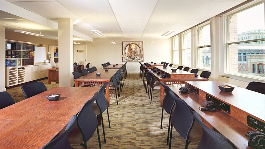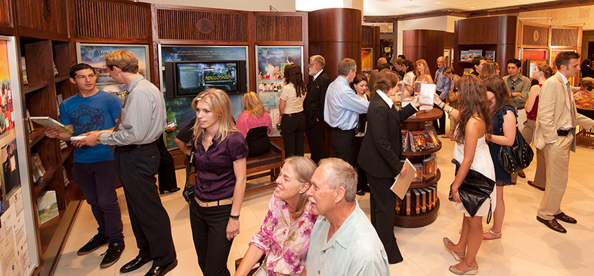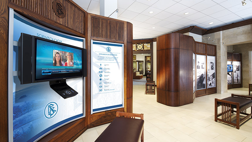 教会員向けのサービスに加え、新しい教会は、回廊のすぐそばに広大なワンフロアのパブリック情報センターを備えています。マルチメディアを駆使した展示パネルには、サイエントロジーの信条、創設者L. ロン ハバードの生涯、教会が推進するさまざまな社会福祉事業や地域貢献活動などが映像や写真付きで紹介されています。