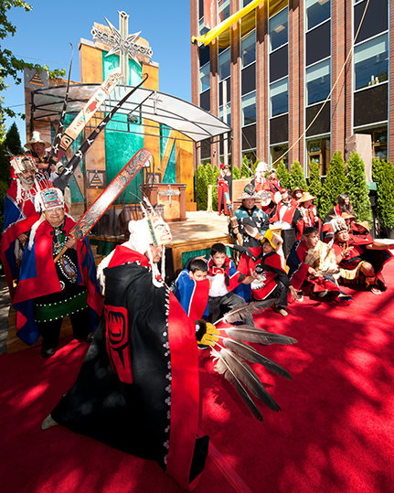 式典の始まりに、この教会の開幕を祝して何世紀も前から伝わる祭礼の儀式を行ったのは、ドワミシュ族の長セシル・ハンセンでした。この都市の名前の由来であるシアトル酋長の子孫です。