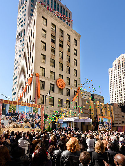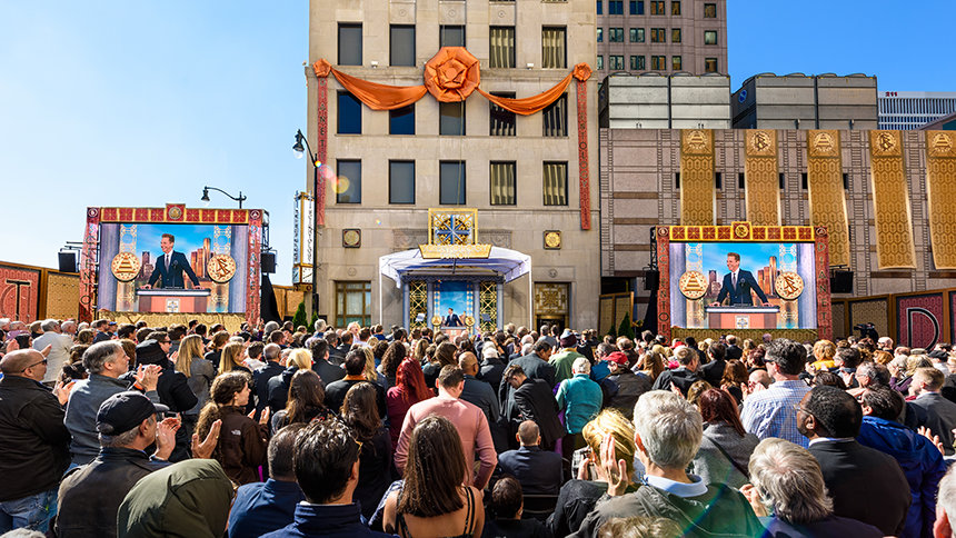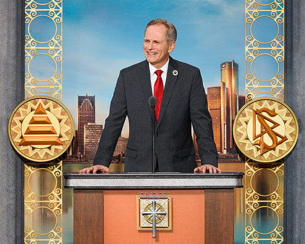 壮大な祝賀会の背景は、150ウエスト・ジェファーソン高層ビルのすぐ東、デトロイトのハート・プラザの真向かいの8階建てのScientology教会です。 その場所は、正に基礎…フォート・ポンチャートレインで最初の建物の場所…後にデトロイトの街となった所です。 一方、物語にさらに意味を加えると 、その落成された建物は、1701年に建設された街の最初の教会でもありました。
