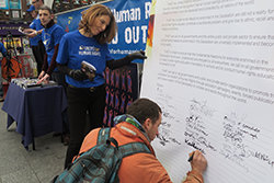 キーオ女史はさらに、ユナイテッド・フォー・ヒューマンライツの旗の下、過去12ヵ月にもたらされた全国的な人権活動について話されました。「少年少女たちが『私もやりたい』と教育プログラムに参加し、いじめ対策を組み合わせたワークショップの中で、皆さんの人権小冊子を受け取っています。 実際、南はコークから西はリマリック、ゴールウェー、さらには東はダブリンまで、48名のボランティアがこのプログラムを使っています。 教育者キットを脇に抱え、彼らはセミナーや講演を行い、向かった先のいたるところで人権の種を撒いています。 そして3000人近い生徒がプログラムを卒業し、人権を守る軍隊を急速に作っているのです。』