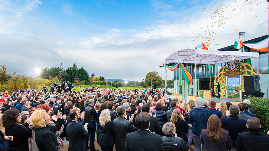 私たちの先駆的な政治指導者で詩人のひとりであるパトリック・ピアースは、こう言いました。『Tír gan teanga, tír gan anam.』(アイルランド語) 『言語のない国は、魂のない国である』という意味です。 ですから気付かずに、意図せずして行ったことかもしれませんが、今日、皆さんが達成しつつあることは、実際に、そして実質的に、アイルランドの魂を生かし続けるようにすることなのです。」