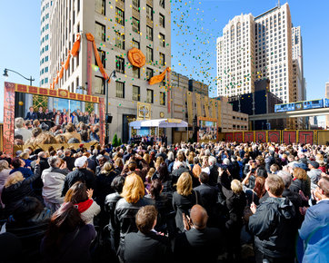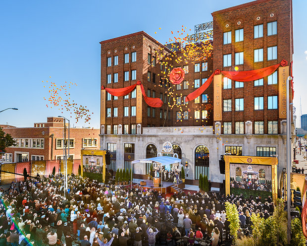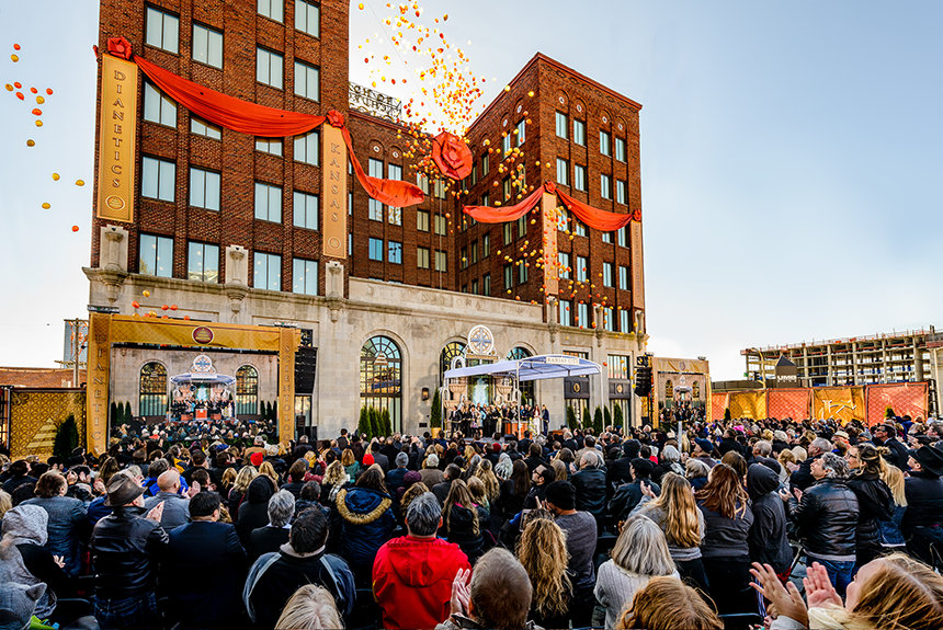 太陽に恵まれた秋の日が完璧な背景となり、注目の新しいScientology教会がそのドアを開けるのを歓迎するために、1,000人以上の聴衆が18番通りとグランドに集まりました。