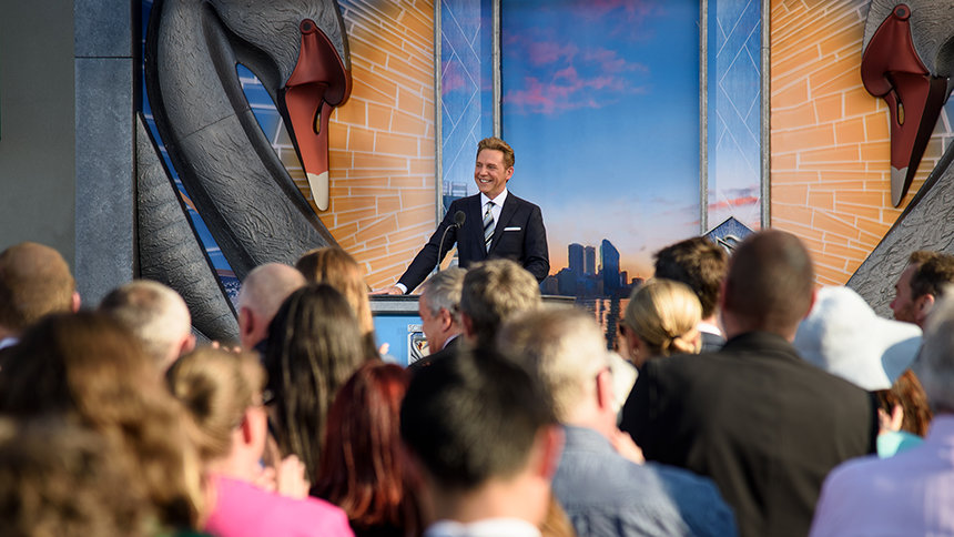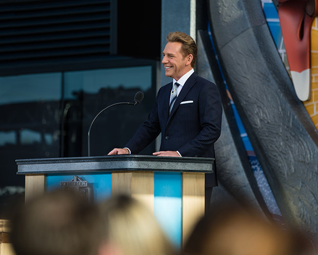 サイエントロジーの教会指導者であるデビッド・ミスキャベッジ氏は、14,500キロを旅してパースに到着しました。 彼はグランド・オープニング参加者に、また別のリボン・カットのためにすぐに3.2万キロの旅に出る予定だと話しました。 パースで、ミスキャベッジ氏はこのように述べました。「これがみなさんが待っていた『今』です。」