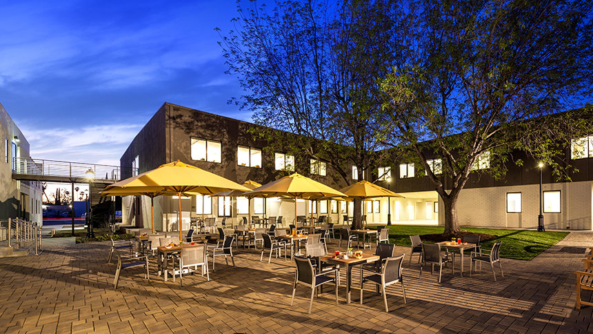 新しい教会は、バーバンク大通りとランカーシム大通り、さらにトゥハンガ・アベニューが交わる、北ハリウッドの賑やかな六差路のすぐそばにあり、日に6万台の車が通過していきます。 4エーカーの土地に広がる8,800平方メートルの施設は、ノーホー芸術地区からわずか数区画のところで、地域中のコミュニティーの改善に向けた態勢が整っています。