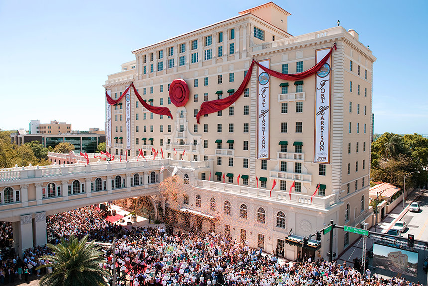 多数の参列者を前に、デビッド・ミスキャベッジ氏によるスピーチは、次のような言葉から始まりました。「この建物は、骨組みは丈夫で育ちも申し分なく、居住環境はフロリダ州クリアウォーターというこの上ないものです。この建物はもともと1926年にオープンし、『南フロリダのホテルの貴族』と呼ばれ、『絵に書いたような美しさ』という形容でこの沿岸全域で知られていました。結婚披露宴、ファッションショー、お茶会、ロータリークラブの式典など、この街の人気スポットとして常に賑やかな拠点となっていました。