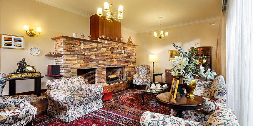 屋外では、プールは古典的な形とターコイズ色に復元されています。 しかし、最も息をのむようなものは、内部にある石造りの暖炉でしょう—その美しさと、驚くべき経緯の両方において。 後の所有者がそれを解体し、石を庭の壁に再利用したのです。 それらは修復の専門家によって回収され、手作業できれいにされ、元の美しい姿に忠実に戻されました。数え切れないほどの物語を温かく見守ってきたそれらは、この史跡を訪れる全ての人にその瞬間を明かす準備ができています。