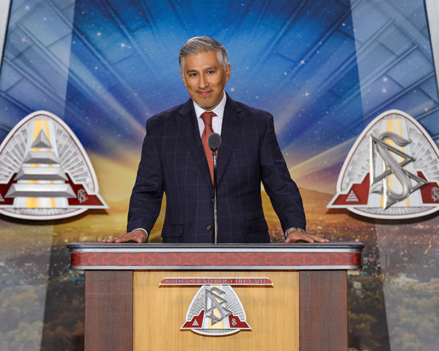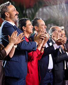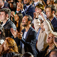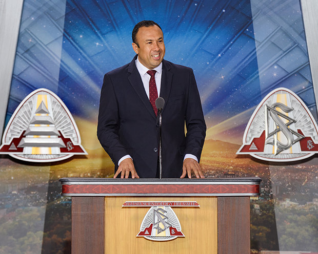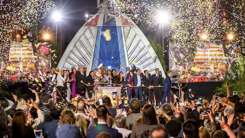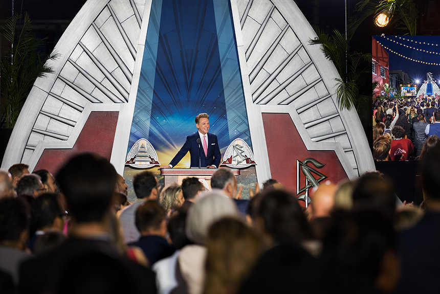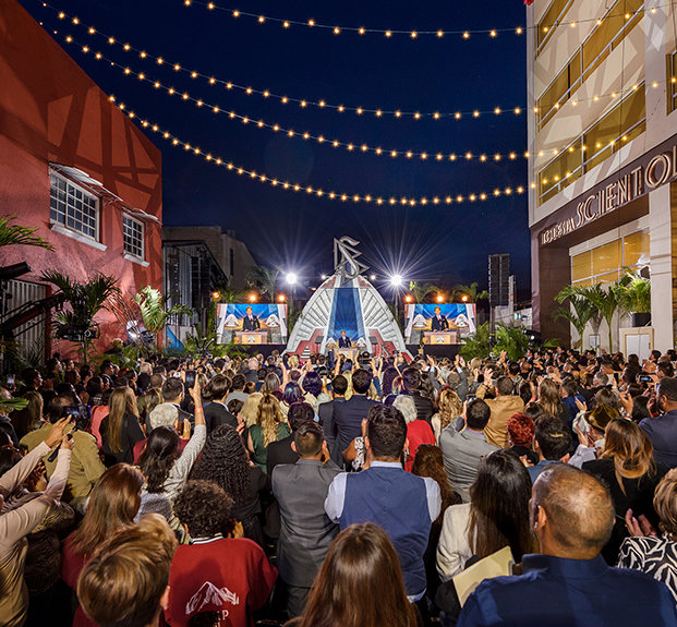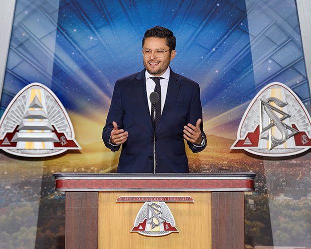 Scientology宗教の教会指導者デビッド・ミスキャベッジ氏が出席者全員に話しをするためにステージに上がると、厳然とした大歓迎となりました。 「忘れないでください。理想のオーグの真髄、そして生命力は、私たちの創設者が思い描いたように、『自由を達成するために人々がやって来る活動の場であり、その人たちはそこでそれを到達するという確信を持っています。』 それこそが、今日、私たちが祝うものです。 それは皆さんが拡張させている贈り物です。 そしてそのビジョンは皆さんによって現実となりました。この理想のオーグを創造する、このムーブメントのヒーローたち」とミスキャベッジ氏は語りました。 「このラテンアメリカのメガシティを創る歴史を見たいですか? ええ、その瞬間がやってきました—まさに今、ここで。」
