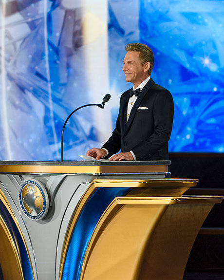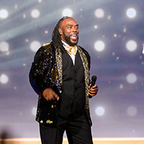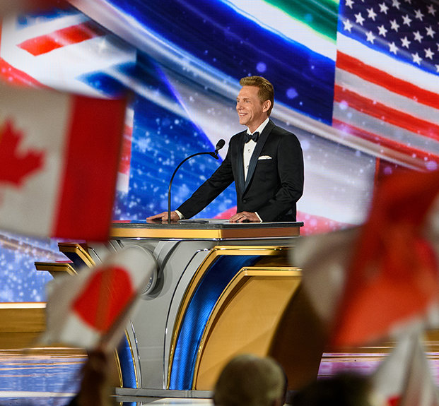 Scientology宗教の教会指導者、デビッド・ミスキャベッジ氏が、忘れられない夜の始まりを待ちわびる活気に満ちた群衆の前で、グランド・マーキーのステージに立ちます。