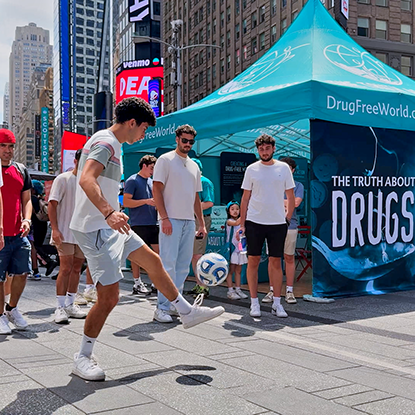 薬物乱用に対抗する国際的な前線を形成する薬物のない世界は、何百万部もの「真実を知ってください: 薬物」 を配布。 小冊子が、FIFAクラブ・ワールドカップやスーパーボウルといった世界的な交差点や巨大なスポーツイベントで、手から手へと渡されました。 合計で、財団は150ヵ国、2,700のイベントを通じて、「真実を知ってください: 薬物」を広めました。