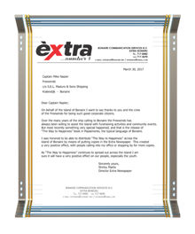 スペイン人の客室スチュワードは「仲間と一緒にもっと良い人間になりました。それもロンのおかげです」 ポルトガルの起業家も同様に、LRHから得た「パワー」によって「今日の自分がいる」と語りました。 続いてカリブ海シナゴーグの会長は、今でも大切に保存されている写真情報誌の中で、ハバード氏について、新世界(アメリカ)で最も古いシナゴーグの「ムードや雰囲気を見事に捉えている」と述べました。 最後に、L. ロン ハバード船長の思い出として、島のラジオ・パーソナリティーでもある建築家が、カリブ海のクラスメートに教育を通じて力を与えるように促しました。「私にとって彼は一船長であるだけでなく、私たちの人生を導いてくれる船長でもあります。」