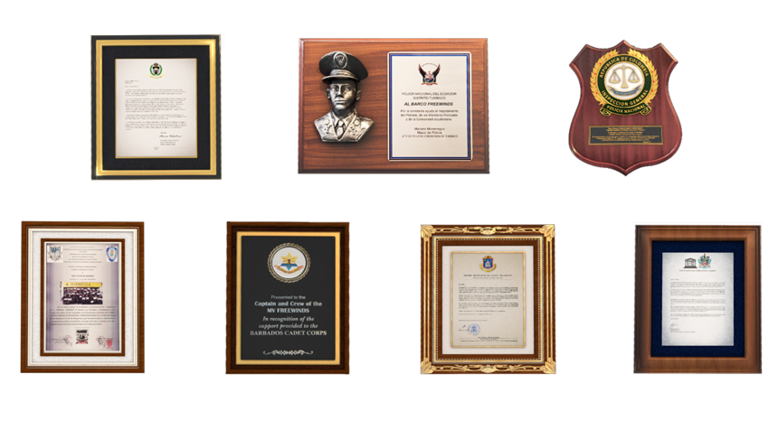 現在までに、フリーウィンズの終わることなく続くの慈善努力は、すべてのカリブ海の友人、そしてよく訪れる島々と港、アンティグア、ドミニカ、セントマーティン、セントキッツ、トルトラ、バージン・ゴルダ、セントビンセント、バルバドス、グレナダ、アルバ、ボネール、キュラソー、フリーポートとナッソーから450以上の賞、感謝状、心からの宣言が贈られました。