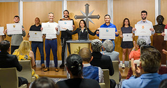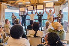「ここで、あらゆる理想のオーグに不可欠な最終要素、そして、毎年の新年祝賀会を締めくくるものへとやってきます。 すなわち、世界に広がるパワー・フィールド・スタッフ・メンバーの大軍団を称える、年に一度の表彰式です」とミスキャベッジ氏は宣言しました。 その後、世界各地からの記録的な数の230人のフィールド・スタッフ・メンバー (FSM) がステージに登場し、それぞれが、1年で100人以上を完全なる自由へのブリッジに乗せ、昇らせたことを称えるパワーFSMピンを受け取りました。 その栄誉の頂点を飾ったのは、2024年に1,000人の人がブリッジに乗り、昇るのを助けたエリートFSMのランクに上昇した、今までに例のない9人のサイエントロジストの表彰でした。