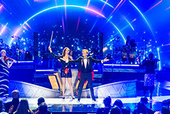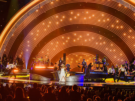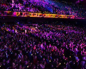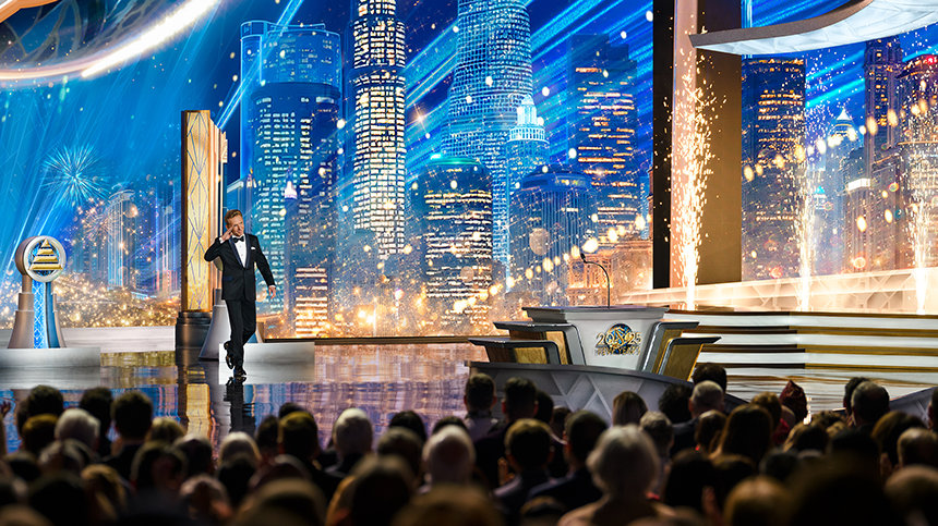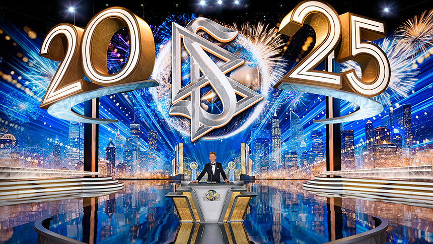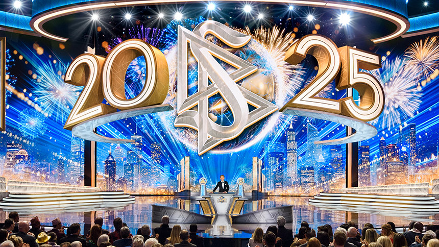 イベントは、華やかなコンサートで幕を開け、聴衆は総立ちとなりました。 舞台を囲むきらびやかな光の柱と、天井から降りてきた巨大な2025によって、期待は急激に高まりました。